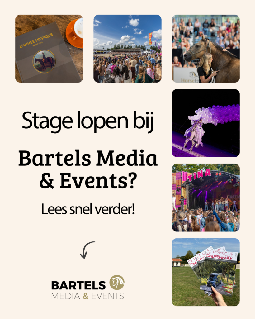 Als stagiair(e) werk je mee aan evenementen en mediaprojecten zoals Horse Event, Horse Event Youth, Horse Event Superstars, Tina festival, L’Année Hippique en De Hippische Ondernemer. Je doet hiermee waardevolle praktijkervaring op binnen eventproductie, organisatie, marketing en communicatie.